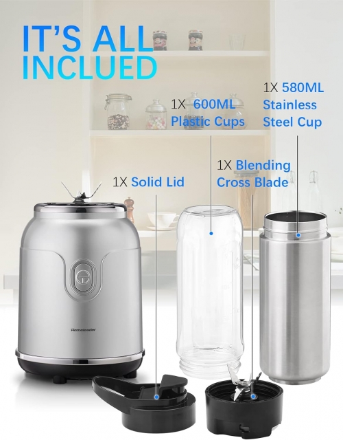 【WHAT'S INCLUDED】: 1 x Motor base, 1 x portable travel cup (stainless steel), 1 x plastic cup and lid, 1 x user manual. The cups are easy to clean. It is very convenient to rinse with water.