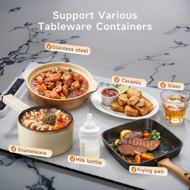 Our dish warmer is compatible with various tableware materials, including metal, ceramic, glass, and enamel. Embrace versatility and convenience as it seamlessly adapts to your dining preferences, enhancing your culinary experience.