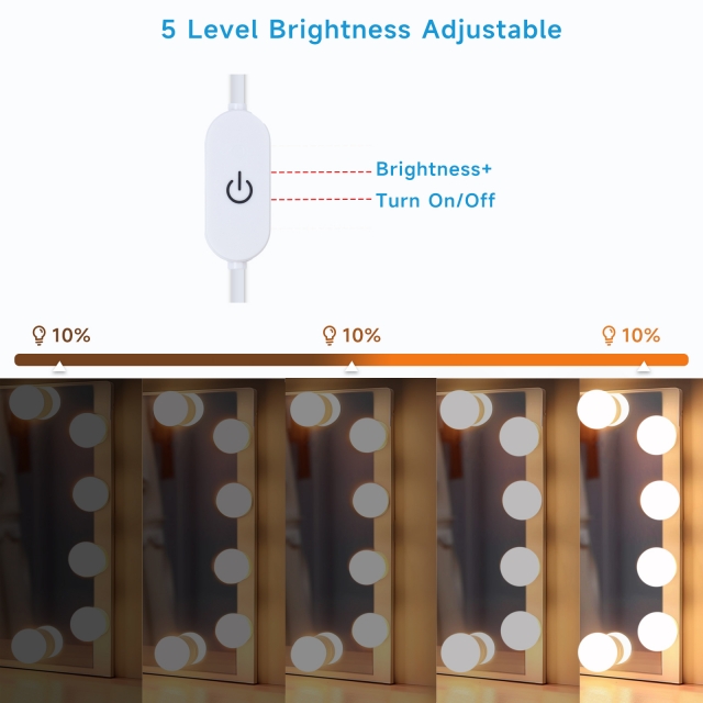 10 ADJUSTABLE BRIGHTNESS & 3 COLOR CHANGING MODES: This stick on lights for vanity mirror are provided with 10 levels of brightness. It will enable you to complete perfect makeup and dressing. You can select the desired brightness by pressing button "+" and "-". And it has 3 color modes, 3200K / 5000K / 10000K Daylight white and warm white and Natural light 3 light color options allowing you to makeup for a long time without hurting your eyes, meet your different needs in different situations.