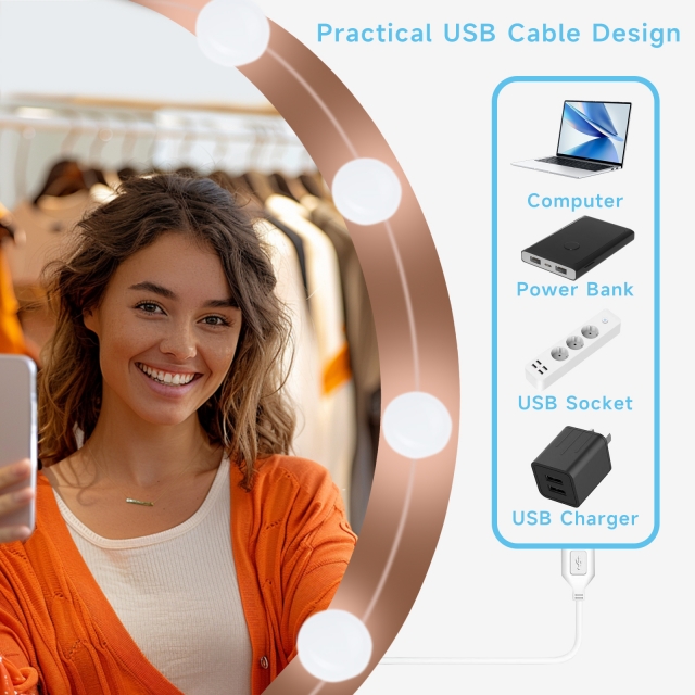 SAFE AND CONVENIENT & WITH ABS FIREPROOF MATERIALS: USB operated mode gets ride of the risk of burning out trouble when using plug. Our string lights is 5V 6500K color temperature.The ball keeps at a low temperature so they are safe to touch without risk of burns after many hours of use. Our LED vanity Lights are safe for children and pets.