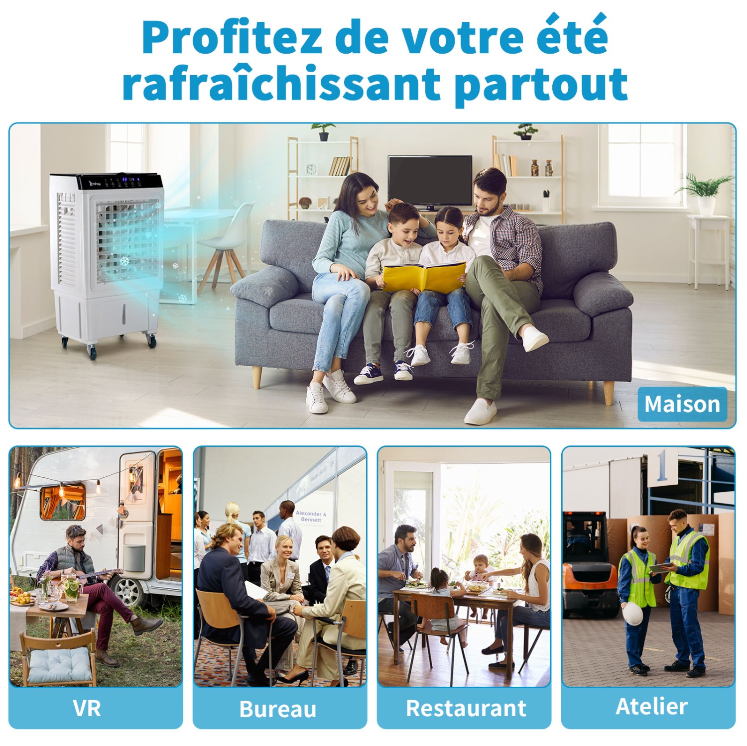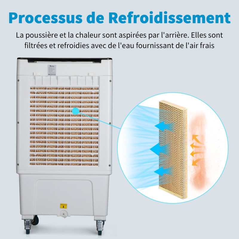 无需弯腰即可在顶部加水。这款便携式蒸发式冷却风扇配备 4 个坚固耐用的 360° 滚轮(2 个可锁定,2 个不可锁定)。即使您不将其用作冷却器,它也能带来强劲的风力!这款冷却风扇可用于户外、半户外和室内,适用于家用和商用。它还可以完美地应用于以下场所:车库、露台、花园、门廊、健身房、电影之夜、烧烤派对、家庭午餐聚会、商店或办公室。